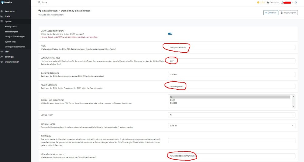 Froxlor schreibt doch auf Wunsch (Einstellungen) eine Datei voller Domains, Separatoren und Keydateinamen sowie die privaten Keys in ein Verzeichnis. Ich habe dazu einen dirty hack, der das in eine rspmad-Konfiguration übersetzt #!/bin/bash chown root._rspamd /etc/postfix/dkim/* SIGNFILE=/tmp/dkim_signing.conf echo "# If false, messages with empty envelope from are not signed" >$SIGNFILE echo "allow_envfrom_empty = true;" >>$SIGNFILE echo "# If true, envelope/header domain mismatch is ignored" >>$SIGNFILE echo "allow_hdrfrom_mismatch = true;" >>$SIGNFILE echo "# If true, multiple from headers are allowed (but only first is used)" >>$SIGNFILE echo "allow_hdrfrom_multiple = false;" >>$SIGNFILE echo "# If true, username does not need to contain matching domain" >>$SIGNFILE echo "allow_username_mismatch = true;" >>$SIGNFILE echo "# If false, messages from local networks are not selected for signing" >>$SIGNFILE echo "sign_local = true;" >>$SIGNFILE echo "# If false, messages from domains not defined here will not be signed" >>$SIGNFILE echo "try_fallback = false;" >>$SIGNFILE echo "symbol = "DKIM_SIGNED";" >>$SIGNFILE echo "use_domain = "envelope";" >>$SIGNFILE echo "domain {" >>$SIGNFILE cat /etc/postfix/dkim/dkim-keys.conf | while read LINE; do DOMAIN=`echo $LINE | awk -F: '{ print $2 }'` echo " $DOMAIN {" >>$SIGNFILE ED_ENABLED="no" if [ -f /etc/postfix/dkim/$DOMAIN.pubkey ]; then ED_ENABLED="yes" ED_SELECTOR=`head -n 1 /etc/postfix/dkim/$DOMAIN.pubkey | awk -F. '{print $1}'` echo " selectors [" >>$SIGNFILE echo " {" >>$SIGNFILE echo " path = \"/etc/postfix/dkim/$DOMAIN.privkey\";" >>$SIGNFILE echo " selector = \"$ED_SELECTOR\";" >>$SIGNFILE echo " }," >>$SIGNFILE echo " {" >>$SIGNFILE fi KEY=`echo $LINE | awk -F: '{ print $3 }'` echo " path = \"$KEY\";" >>$SIGNFILE SELECTOR=`echo $KEY | awk -F/ '{ print $5 }' | awk -F. '{ print $1 }'` echo " selector = \"$SELECTOR\";" >>$SIGNFILE if [ $ED_ENABLED = "yes" ]; then echo " }" >>$SIGNFILE echo " ]" >>$SIGNFILE fi echo " }" >>$SIGNFILE done echo "}" >>$SIGNFILE cp $SIGNFILE /etc/rspamd/local.d/dkim_signing.conf systemctl reload rspamd rm $SIGNFILE Das Skript kannst Du auch durch Froxlor triggern lassen, siehe DKIM-Einstellungen.