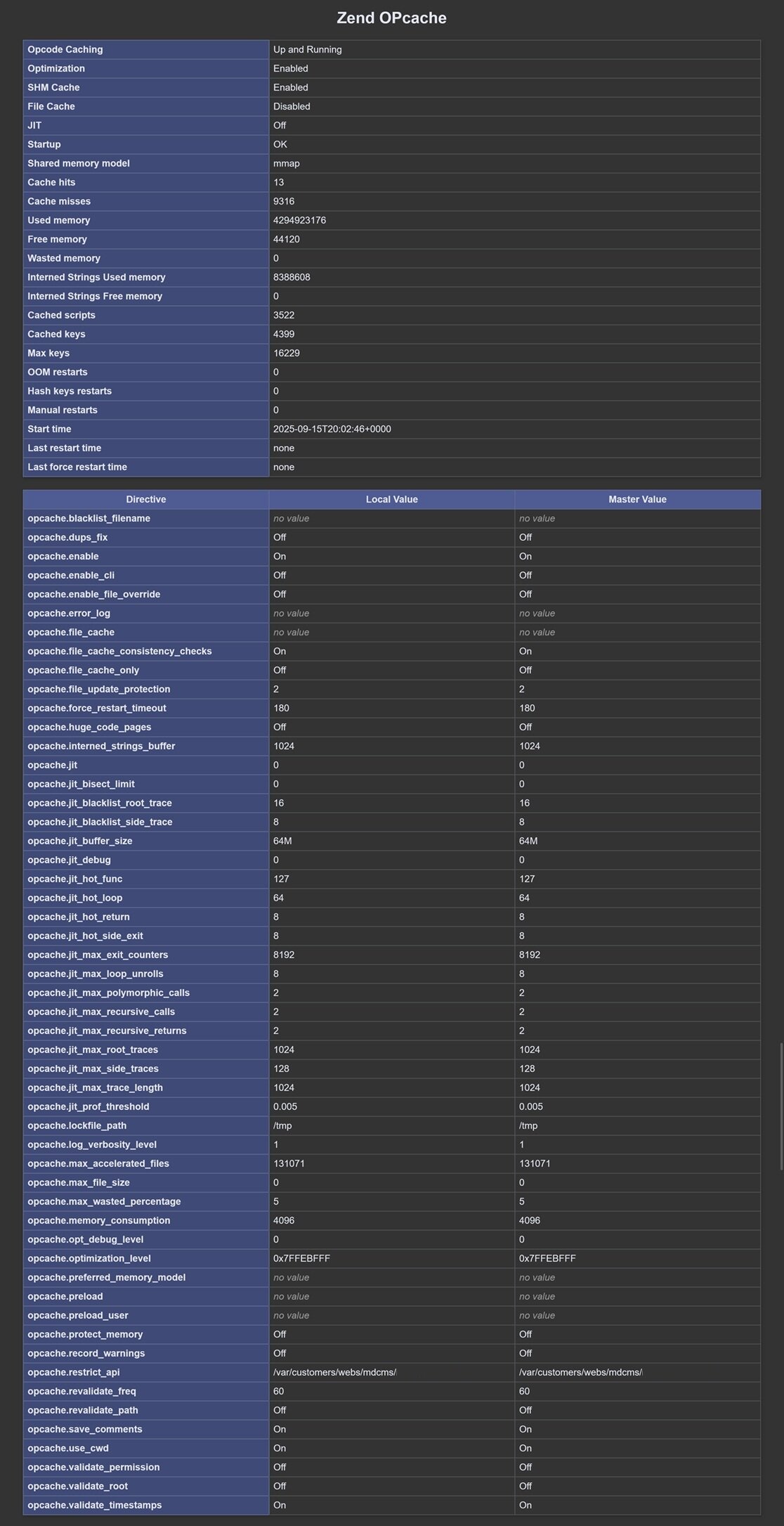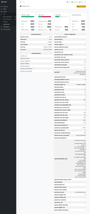 Hello, I was searching for a best practice to setup OPcache in combination with PHP-FPM, Apache and Froxlor, but found none. I tried to read many posts from different forums, but unfortunately I'm not getting anywhere. Also asking AI did not really help. This is my PHP-FPM pool config: php_admin_flag[opcache.enable]=1 php_admin_flag[opcache.enable_cli]=1 php_admin_value[opcache.restrict_api]="{DOCUMENT_ROOT}" php_admin_value[opcache.memory_consumption]=4096 php_admin_value[opcache.interned_strings_buffer]=128 php_admin_value[opcache.max_accelerated_files]=131071 php_admin_flag[opcache.validate_timestamps]=1 php_admin_value[opcache.revalidate_freq]=60 php_admin_flag[opcache.save_comments]=1 php_admin_flag[opcache.fast_shutdown]=1 php_admin_value[opcache.max_wasted_percentage]=5 Somehow the memory usage is immediately full. It does not matter, if I set the memory size to 1024 MB, 4096 MB, 8192 MB, 32768 MB or even 102400 MB. Also the memory usage of the OPcache is not matching with the RAM usage of the server. The server has 12 vCPU and 64 GB of RAM running Debian 12.4. I'm running about 25 small Wordpress sites, each has about 2-3 visitors per hour, so nearly no traffic and load. If I get the cached scripts with opcache_get_status(true) and sum the memory consumption of each script, I'm reaching about 110 MB. In the overview the hits count and cached script count should be much higher, since only two out of 25 Wordpress sites are partially cached. In attachment the OPcache overview page of Froxlor and phpinfo OPcache settings. I'm using PHP-FPM 8.4.12. Is this an OPcache issue, misconfiguration or know behavior? Does anyone have an idea on how to solve that or maybe I should use another caching mechanism? Thanks!
